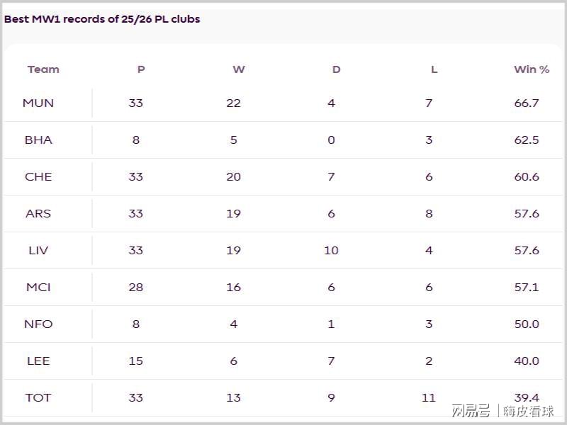 英超官网统计了关于揭幕战的许多数据,过去33个赛季中,首轮获胜机会最大的是曼联,一共取得22场胜利,胜率刚好是三分之二,随后的布莱顿虽然只有8次参赛机会,却取得5胜。紧接着是切尔西、阿森纳、利物浦和曼城等四大豪门,胜率都超过五成,曼城由于早期一度徘徊在低级别联赛,足足少了5次。重新回到英超的升班马利兹联,以及上赛季黑马诺丁汉森林,首轮的表现也是不错的。