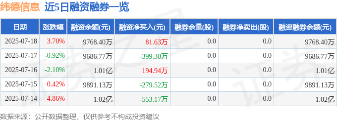 纬德信息融资融券信息显示,融资方面,当日融资买入641.62万元,融资偿还559.99万元,融资净买入81.63万元。融券方面,融券卖出0.0股,融券偿还0.0股,融券余量0.0股间群策略,融券余额0.0万元。融资融券余额9768.4万元。