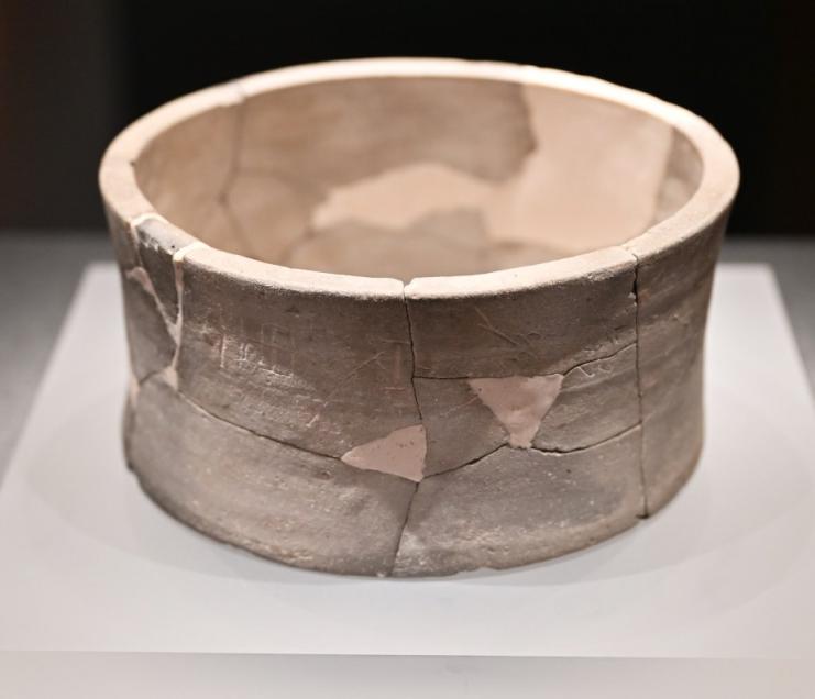 走进展厅正对着一个灰头土脸的小陶碗,看起来不起眼,可千万别小瞧。它学名叫“陶量”。这个陶量在整个古州城展中举足轻重,名为“都乡定里”陶量,因外壁刻有“都乡定里”四字铭文而得名,是2021年雄安古州城遗址出土的一件“重器”。专家介绍,陶量是我国古代用于测量容积的器具,也就是秦始皇统一“度量衡”中的“量”。经考古队实际测试,该陶量的容积为2067毫升,相当于汉代的“十升”,也就是“一斗”。