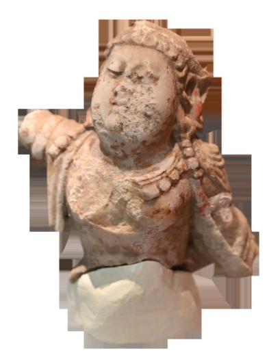 两件龙首出土时的情况很不乐观,修复补全痕迹十分明显。然而修复痕迹也掩盖不了龙首威严。10号龙首鼻似象,眼似兔,耳似牛,面似麒麟,造型兼容并蓄,结合大量瑞兽的特点。同时10号龙首还有很多特征与常规认知中的“龙”有明显区别,顺着讲解员的指引,记者发现,10号龙首头顶共有6个发髻,这些发髻呈螺旋状与佛教的陶塔相似,且两两一组。据介绍,该设计应该是借鉴了佛教元素,也侧面证明了当时佛教在中国的传播。此前考古从未出现过这样的龙首,也为研究者提供了更多历史可能性。此外,10号龙首头顶后背侧的“焰环状”扇状装饰,功能与佛像的背光类似,也可能是受了佛教“火聚光顶”装饰艺术的影响。