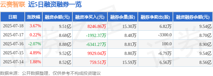 云赛智联融资融券信息显示,融资方面,当日融资买入2.67亿元,融资偿还1.84亿元,融资净买入8246.86万元,净买入额两市排名第12。融券方面,融券卖出7.11万股,融券偿还2900.0股,融券余量15.3万股,融券余额354.04万元。融资融券余额9.54亿元。