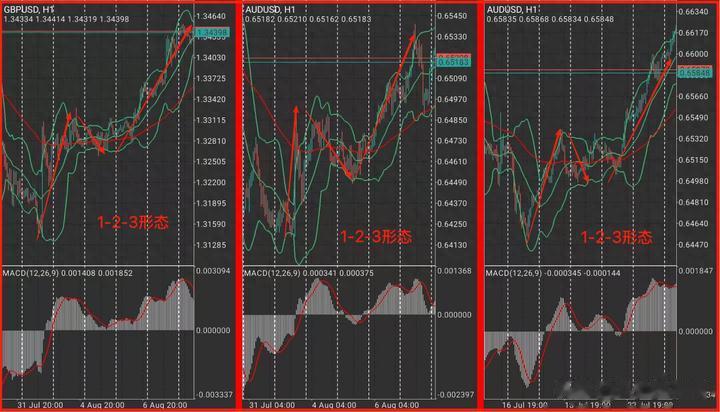 这是近期我做的三笔交易,都是小时图的结构,形态非常相似,都是底部启动,回调上破的1-2-3的结构。