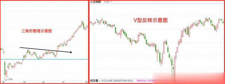 大家可以看下方的图片,就是三角形整理和V型反转的示意图。